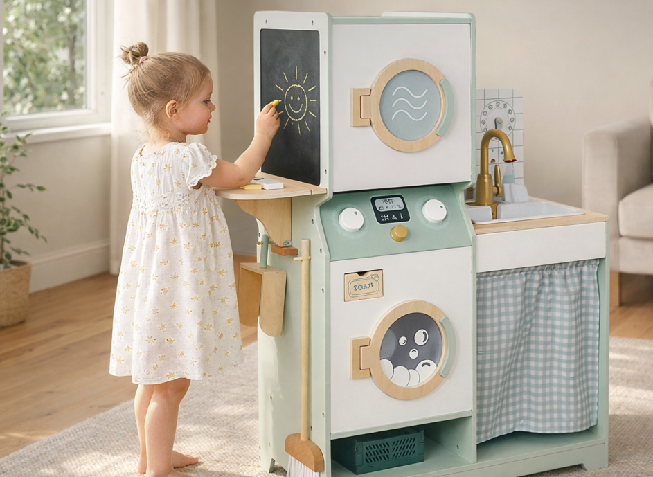 3-in-1 Wooden Kitchen Appliance Playset with Pretend Play Toy Food Accessories