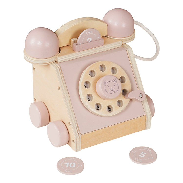 Retro Rotary Design: Functional rotating dial with cute bear motif, movable handset, and rolling wheels for push-along play.